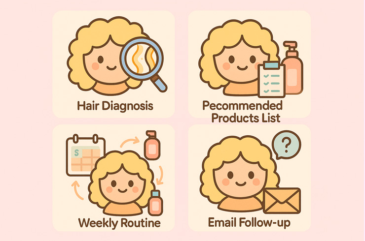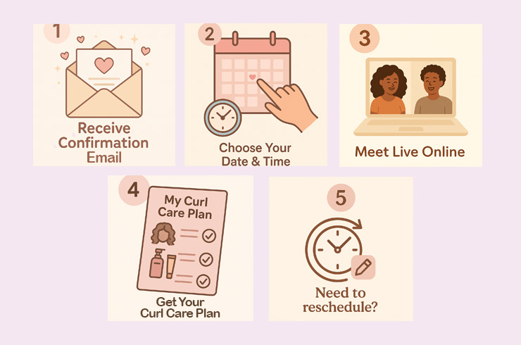💌 Recibe tu plan de cuidado. Después de la sesión, recibirás un correo con tu rutina de rizos, guía de productos y notas de seguimiento.